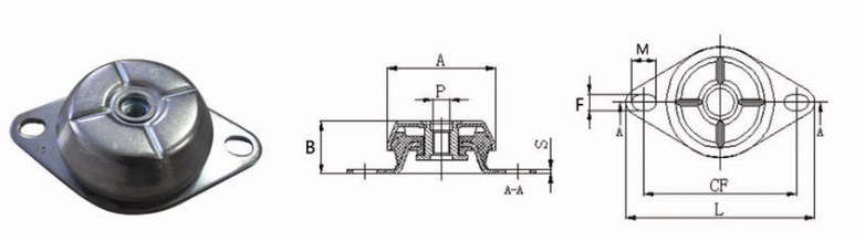 型號(hào) | 橡膠硬度 IRHD (daN/mm) | A | B | P | F*M | CF | L | S | Average Stiffness平均值負(fù)荷(Kg/mm) | Max Load最大荷重(Kg) | Max Deflec.最大壓縮量(mm) |