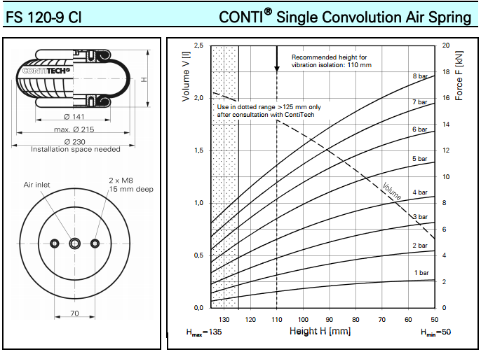 橡膠氣囊工作時,內(nèi)腔充入壓縮空氣,形成一個壓縮空氣氣柱。隨著振動載荷量的增加,彈簧的高度降低,內(nèi)腔容積減小,彈簧的剛度增加,內(nèi)腔空氣柱的有效承載面積加大,此時彈簧的承載能力增加。當(dāng)振動載荷量減小時,彈簧的高度升高,內(nèi)腔容積增大,彈簧的剛度減小,內(nèi)腔空氣柱的有效承載面積減小,此時彈簧的承載能力減小。這樣,空氣彈簧在有效的行程內(nèi),空氣彈簧的高度、內(nèi)腔容積、承載能力隨著振動載荷的遞增與減小發(fā)生了平穩(wěn)的柔性傳遞、振幅與震動載荷的高效控制。還可以用增、減充氣量的方法,調(diào)整彈簧的剛度和承載力的大小,還可以附設(shè)輔助氣室,實現(xiàn)自控調(diào)節(jié)。