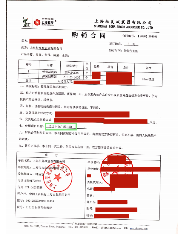 上海松夏減震器有限公司官方網(wǎng)站為您介紹:【長沙運達廣場項目】使用ZTF可調(diào)式彈簧減震器采購合同信息,我們松夏公司2020年為【長沙運達廣場項目】使用ZTF可調(diào)式彈簧減震器,起到了減震和降噪的作用,以下是【長沙運達廣場項目】使用ZTF可調(diào)式彈簧減震器采購合同介紹